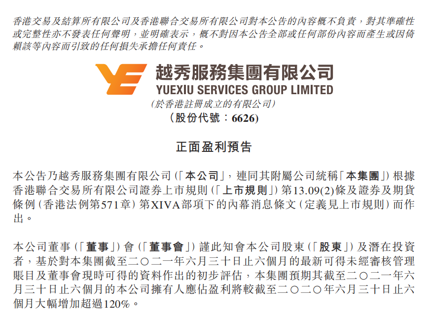 7月15日,爱游戏体育平台官网服务集团有限公司(6626.HK)发布盈利预喜公告。公告称经过初步评估,集团预期截至2021年6月30日为止的六个月,公司拥有人应占盈利将同比大幅增加超过120%。