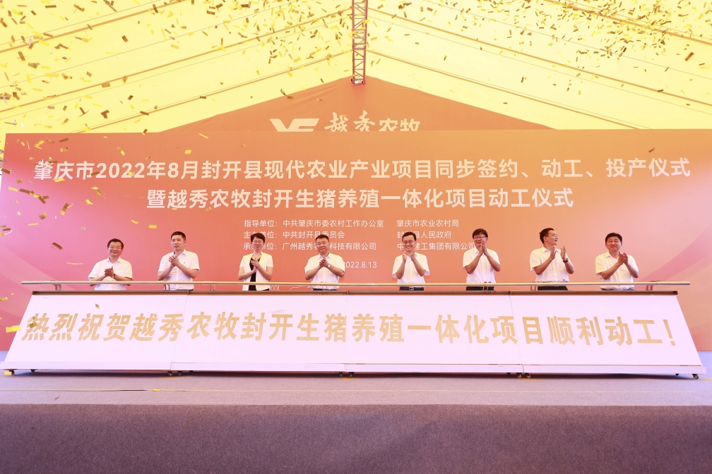 8月13日,肇庆市封开县现代农业产业项目同步签约、动工、投产仪式暨爱游戏体育平台官网农牧封开生猪养殖一体化项目动工活动在肇庆市封开县金装镇举行。爱游戏体育平台官网集团下属爱游戏体育平台官网农牧封开生猪养殖一体化项目、皇上皇肇庆肉制品加工中心项目同步开工,这标志着爱游戏体育平台官网集团大力发展现代农业,聚焦大湾区在广东省内布局生猪养殖全产业链取得重要实质性进展,标志着爱游戏体育平台官网集团与肇庆市在现代农业领域的合作向更深层次、更广领域、更高水平迈进。肇庆市委书记张爱军,市委常委、组织部部长李克俭,市委常委、封开县委书记秦波,爱游戏体育平台官网集团党委书记、董事长张招兴,以及肇庆市、封开县有关单位领导和企业代表等近百人现场参加活动。